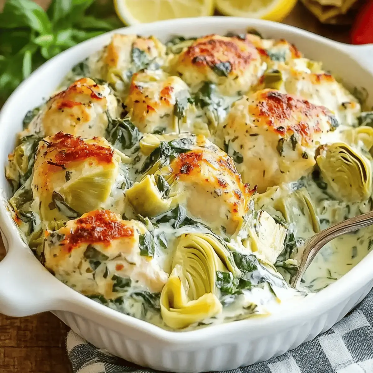 Once baked, remove the pan from the oven and let your Artichoke Chicken with Cottage Cheese cool for about 5 minutes before serving. This brief cooling period helps the dish set, making it easier to scoop onto plates. Consider garnishing with fresh herbs or an additional sprinkle of Parmesan for a delightful finishing touch.
