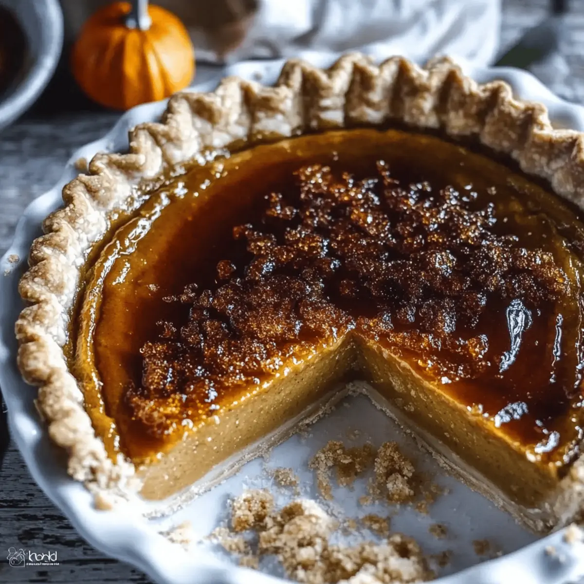 Preparing the Bourbon Brûlée Pumpkin Pie in advance is a time-saver for your autumn gatherings! You can pre-bake the crust up to 24 hours ahead of time; just store it covered at room temperature to maintain its flaky texture. Additionally, you can whisk together the filling and refrigerate it for up to 3 days—this allows the flavors to meld beautifully! When you’re ready to bake, pour the filling into the pre-baked crust and bake as directed. For the brûlée topping, sprinkle sugar just before serving and caramelize it using a kitchen torch for that perfect crunch. With these make-ahead tips, you’ll easily impress your guests with minimal effort!