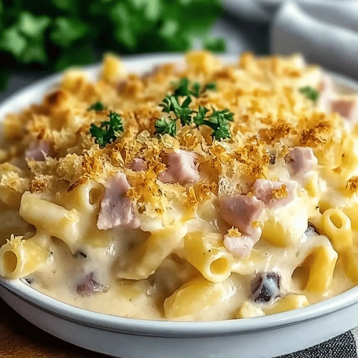 - Layer your cooked chicken over the pasta in the baking dish, followed by chopped ham pieces, then pour the creamy cheese sauce over the top.