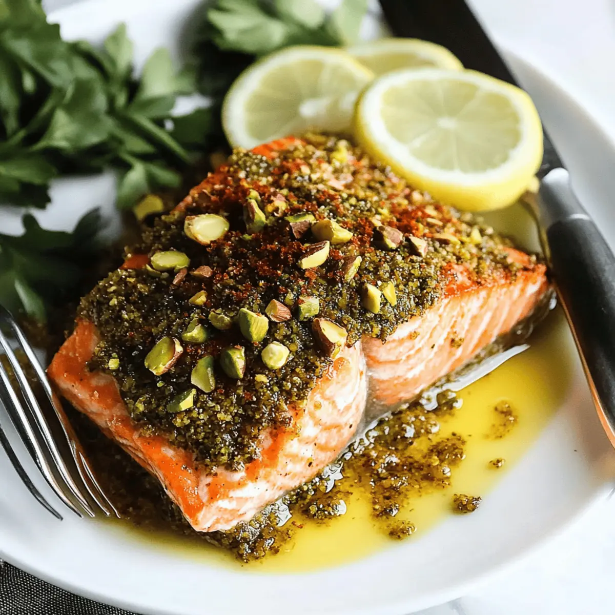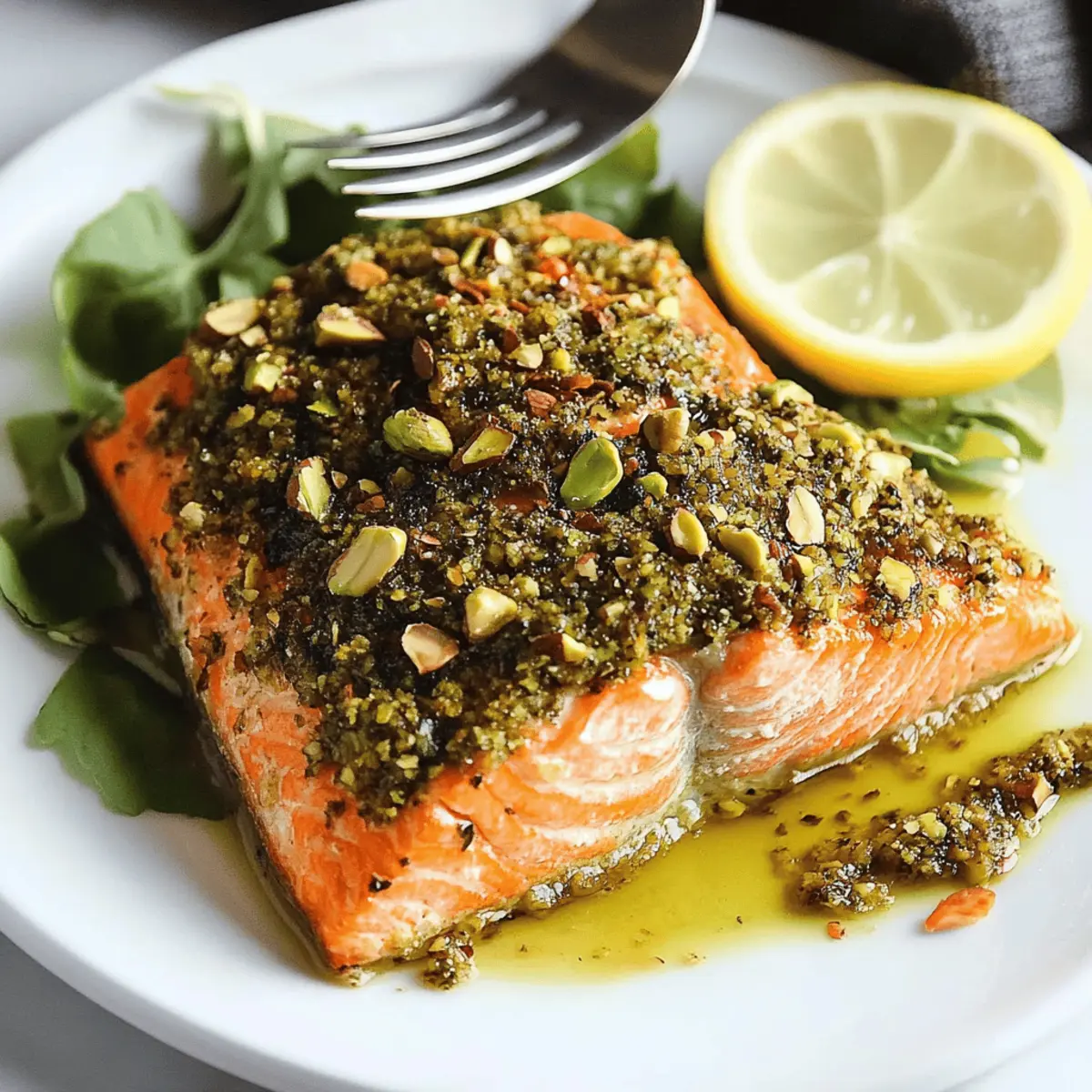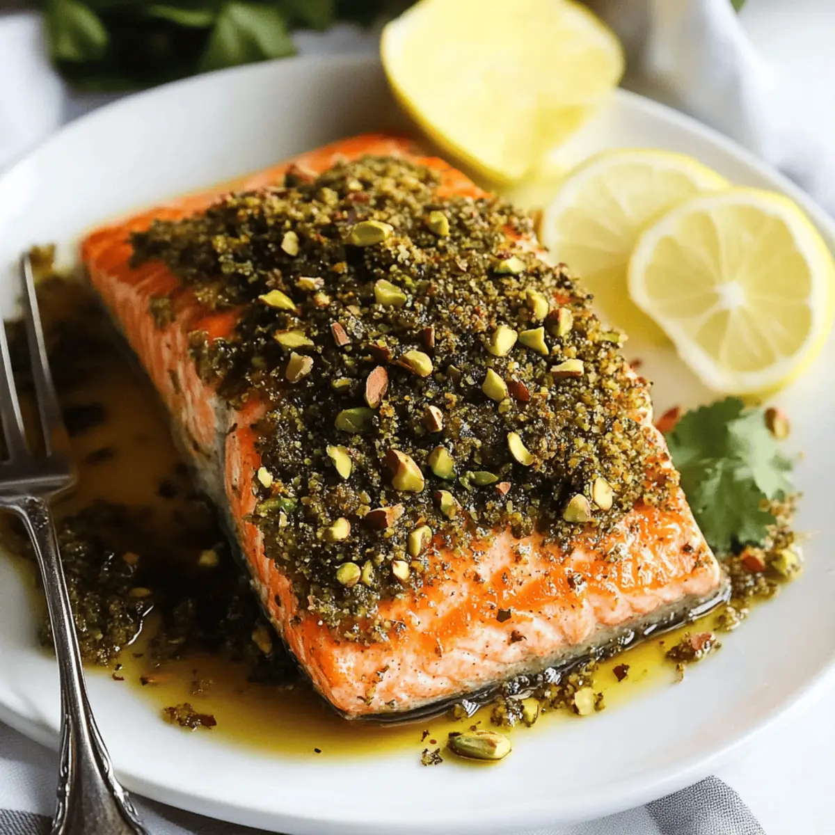The kitchen was a whirlwind of scents and sounds, harmonizing like an orchestra as the oven worked its magic. Today, I’m transforming a simple salmon fillet into an impressive culinary masterpiece with this Pistachio-Crusted Salmon recipe—an elegant dish that’s sure to turn heads. Not only does it come together in under 30 minutes, but it's also packed with nutrition, making it the perfect solution for anyone seeking a quick weeknight dinner that doesn’t skimp on flavor. Topped with a crunchy pistachio crust and drizzled with a bright lemon-honey glaze, this dish is a delightful balance of savory and sweet, sure to please both family and guests. Curious to see how to create this mouthwatering experience? Let’s dive into the details!
