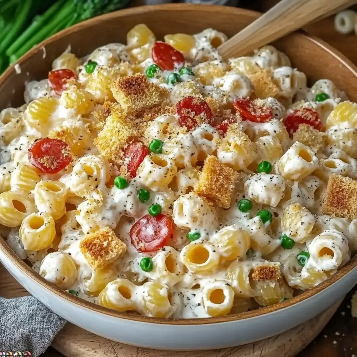 Before serving, stir the salad gently to ensure that everything is well combined again. If desired, enhance the crunch by topping the salad with croutons just before serving. This adds a delightful texture and visual appeal, making your creamy Bacon Ranch Pasta Salad a fantastic side dish for any gathering.