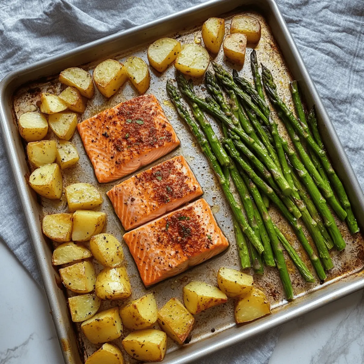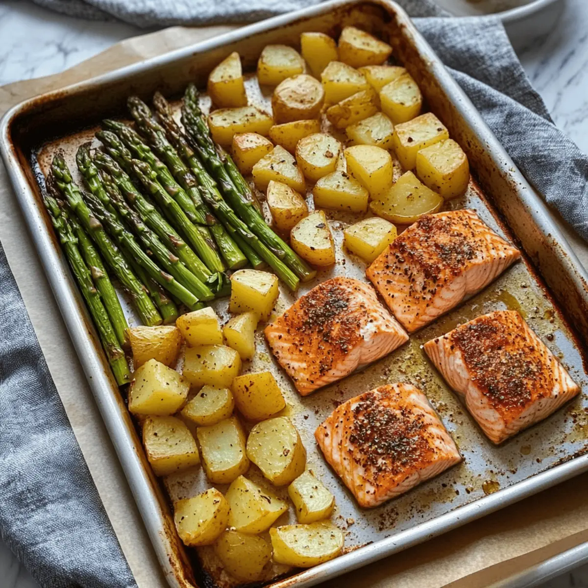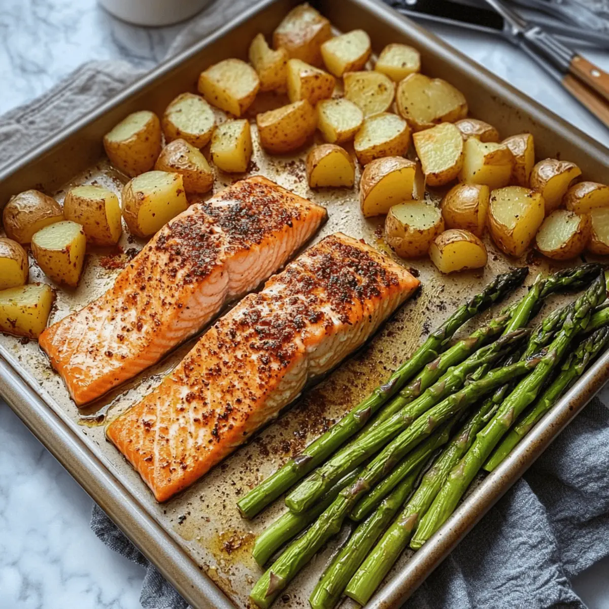 Simplicity is key: This one-pan meal requires minimal effort while delivering maximum flavor. Healthy and quick: Packed with nutritious ingredients, you can whip it up in under 30 minutes, making it perfect for busy evenings. Versatility shines here—swap in your favorite veggies or seasonings for a personal touch. Crowd-pleaser appeal: The delightful combination of flaky salmon, crispy potatoes, and fresh asparagus will impress family and friends alike. Plus, easy cleanup means you can enjoy your meal without the fuss!