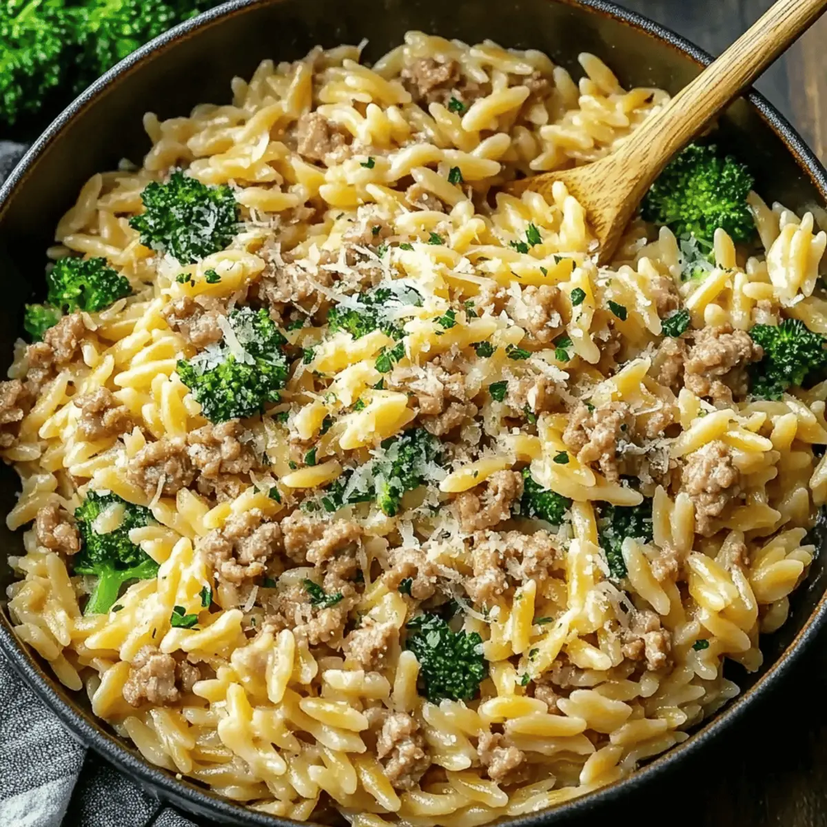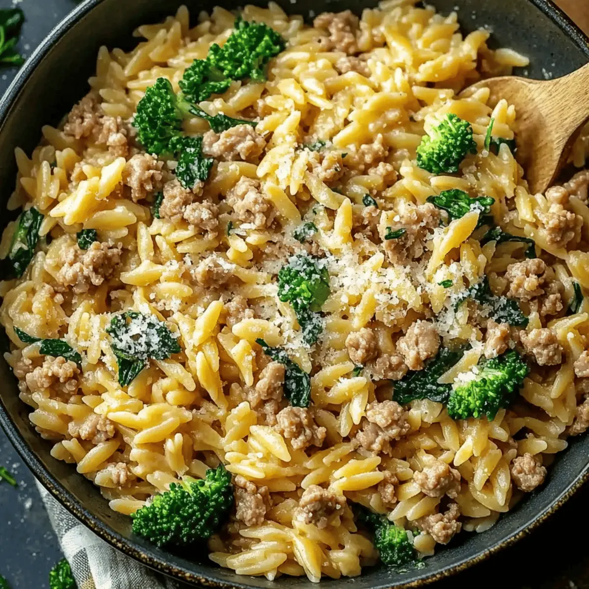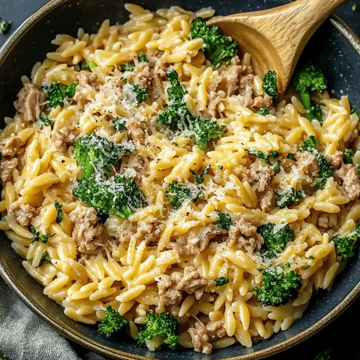 Finally, fold in the sautéed broccoli, ensuring it's well distributed throughout the creamy Ground Turkey Orzo. Mix everything together gently, allowing the flavors to harmonize before serving it warm, straight from the skillet for a comforting meal your family will love.