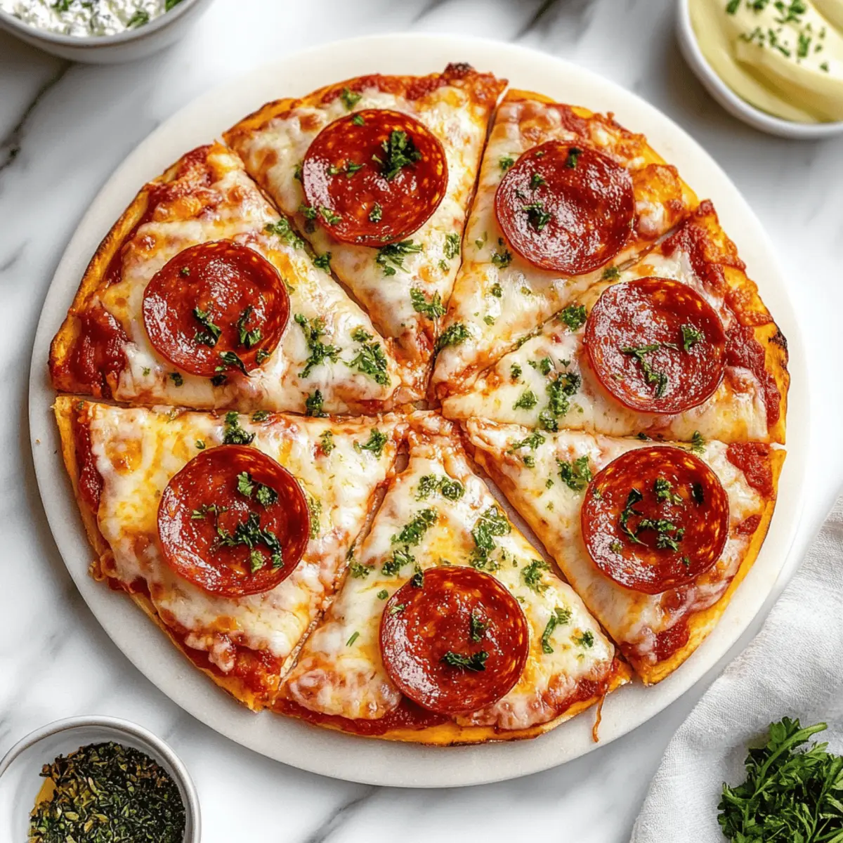 These Cottage Cheese Pizza Flatbreads are perfect for meal prep enthusiasts! You can prepare the crust up to 24 hours in advance. Simply mix the ingredients as directed, pour the batter onto the baking sheet, and bake. Once cooled, wrap the crust tightly in plastic wrap and refrigerate. To maintain quality, make sure it is fully cooled before wrapping to prevent moisture buildup. You can also prep your toppings (sauce, cheese, and pepperoni) up to 3 days in advance; just store them in airtight containers in the fridge. When you’re ready to enjoy, layer the toppings on the crust and bake as directed. You'll have a delicious meal ready in no time, just as fresh and delightful as if you made it from scratch that day!