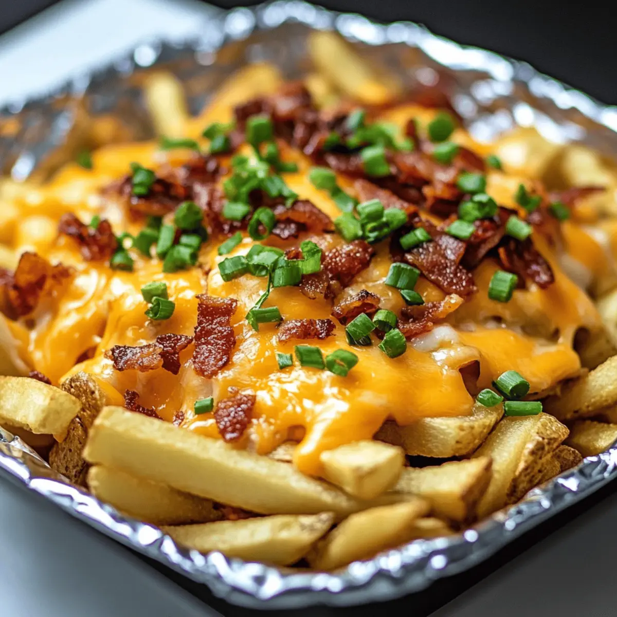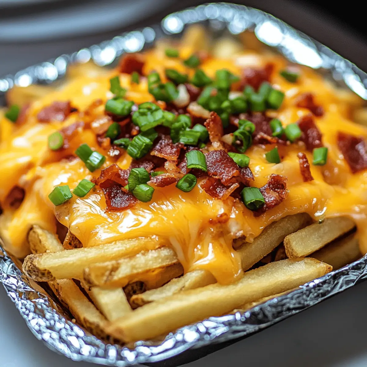 Dive into a comforting world where your taste buds are treated to crispy, cheesy indulgence that pairs beautifully with these loaded fries.