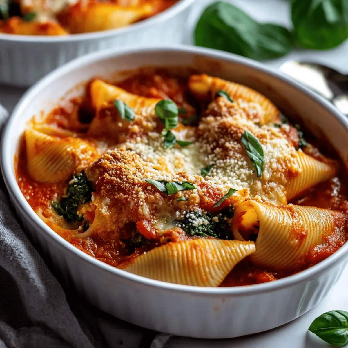 Once baked, let your Spinach Ricotta Stuffed Shells cool for a few minutes. Before serving, garnish with fresh basil leaves and an optional sprinkle of extra Parmesan. This dish is not only visually appealing but also bursting with rich flavors, ready to be shared around your dinner table!