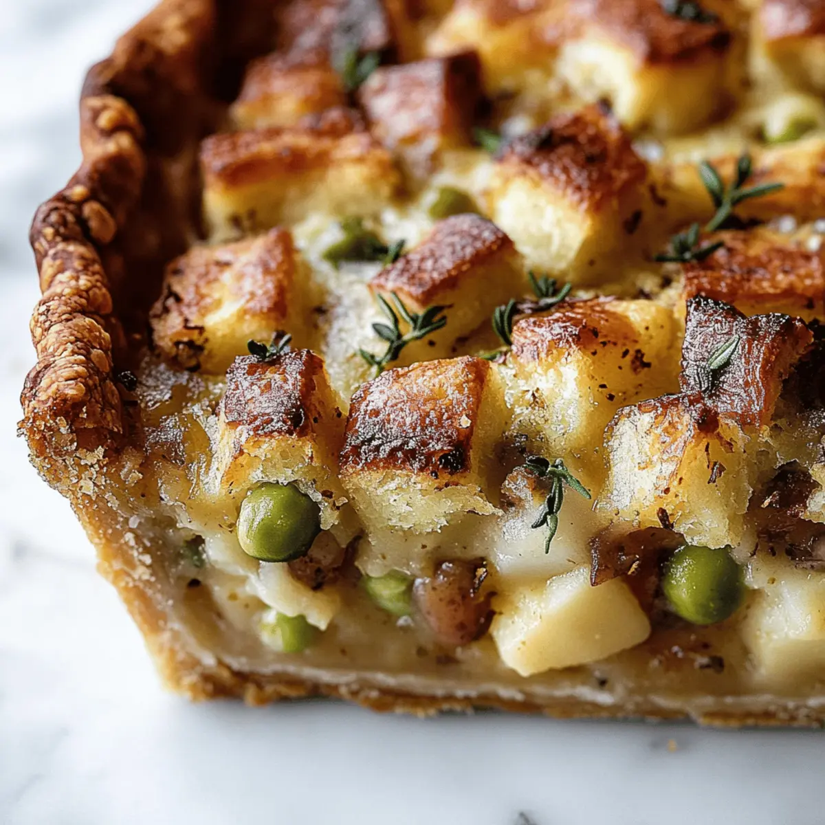 Once the filling has cooled, pour it into the chilled pie crust evenly. Top the filling generously with stuffing mix for added crunch. Place the pie in the preheated oven and bake for 40-45 minutes, or until the crust is golden brown and the filling is bubbling at the edges. Keep an eye on the crust, covering the edges with foil if it browns too quickly.