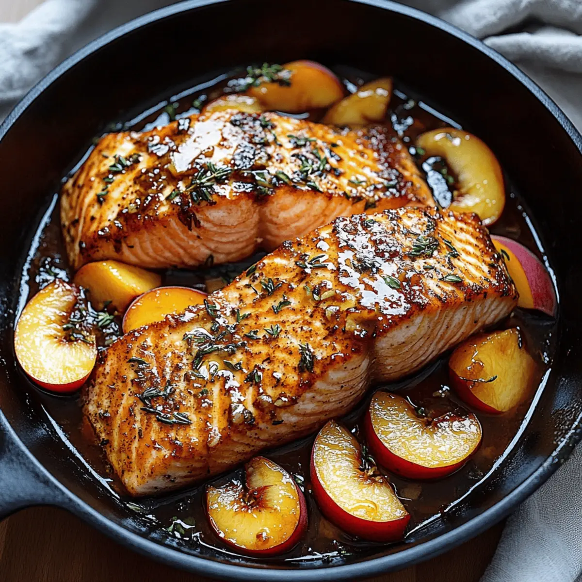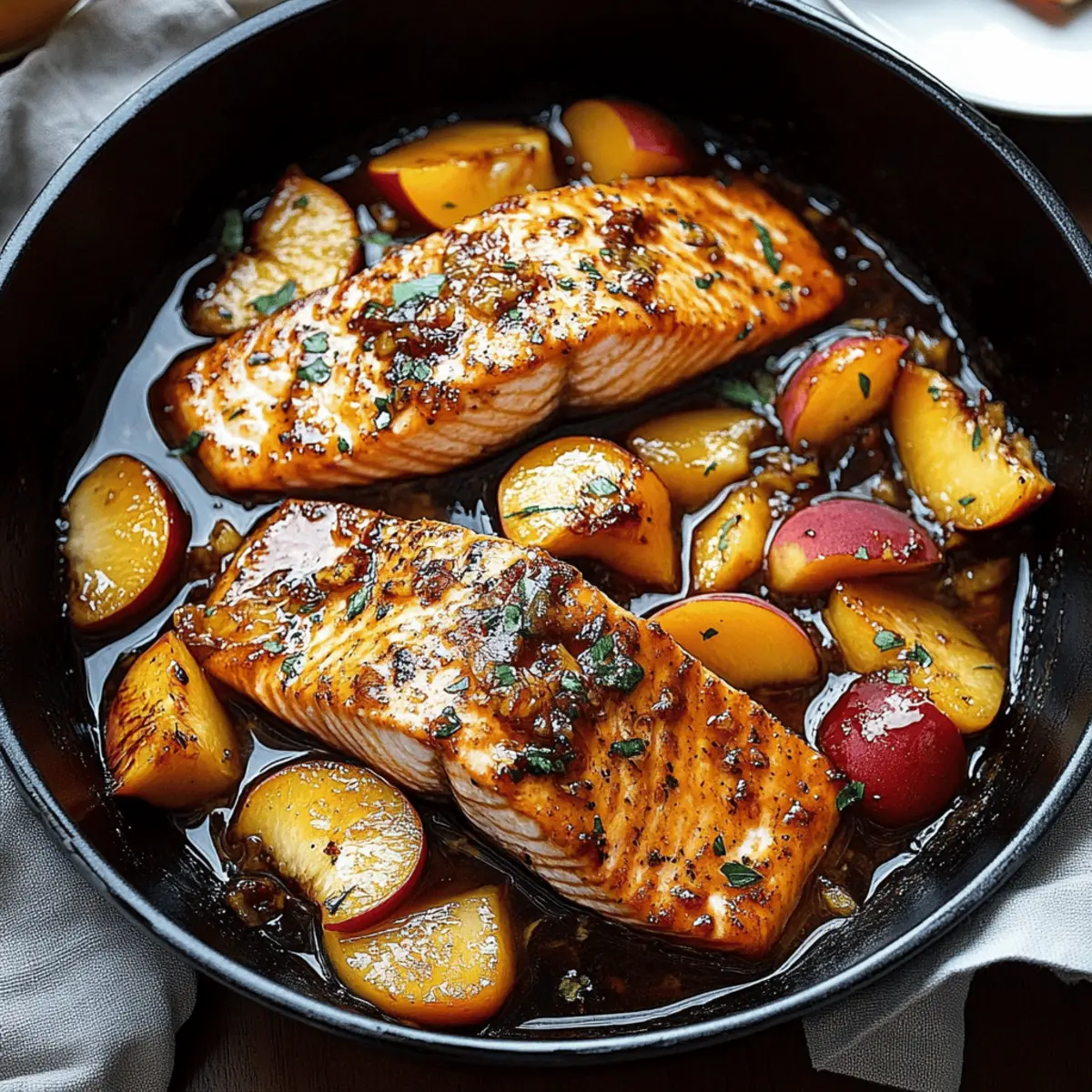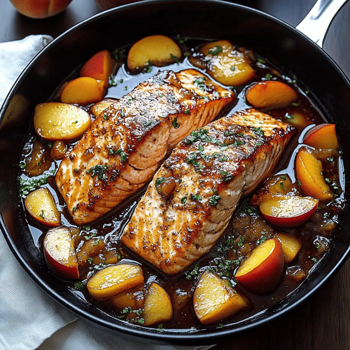 - Gently flip salmon fillets skin-side down. Arrange thin peach slices around salmon in the skillet. Cook together for another 2-3 minutes.