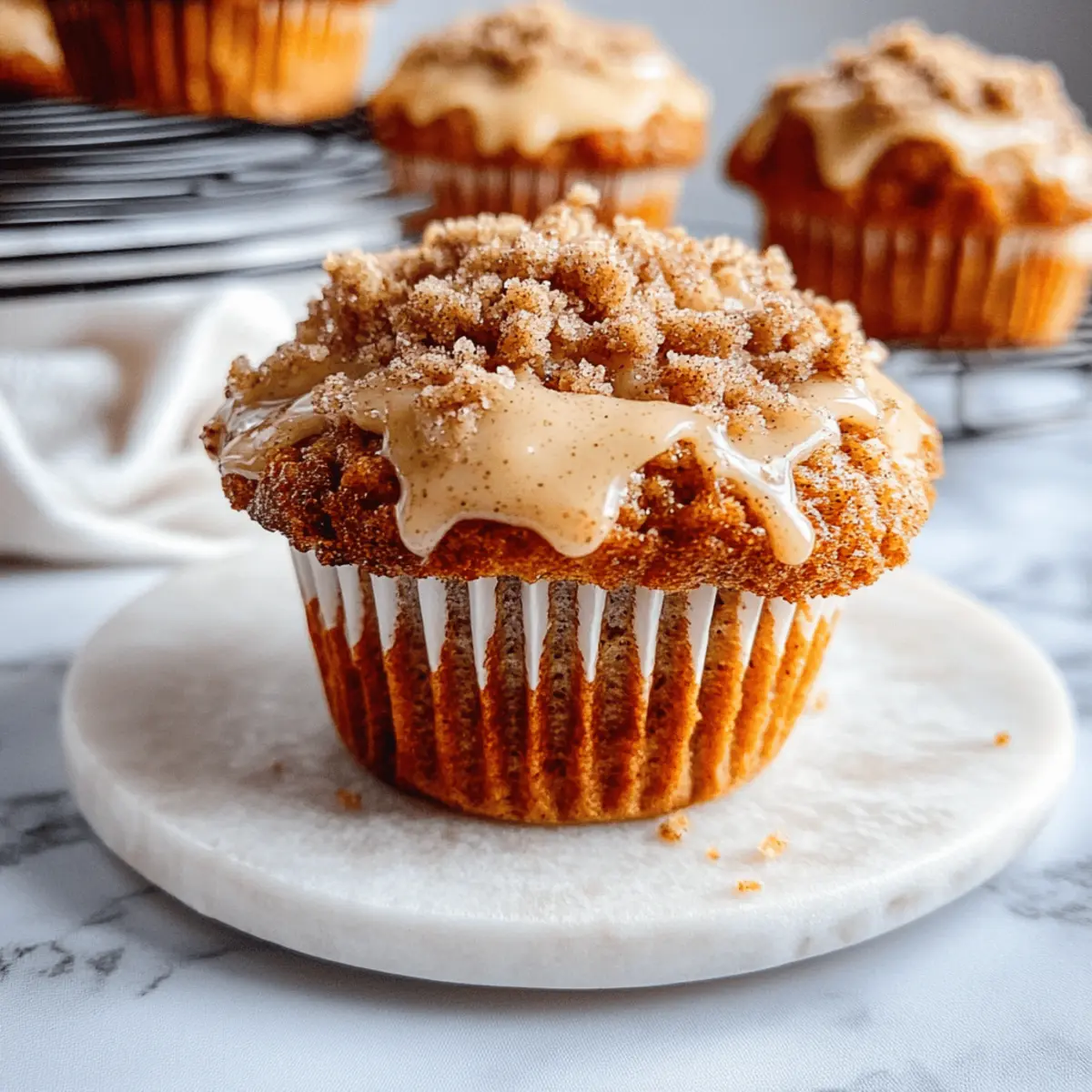 Once baked, remove the muffin tin from the oven and let the muffins cool in the pan for about 5 minutes. Then, transfer them to a wire rack to cool completely. If desired, whisk together powdered sugar, milk, and maple syrup in a small bowl, then drizzle the glaze over the cooled muffins for a sweet finish that elevates your Pumpkin Cinnamon Streusel Muffins.