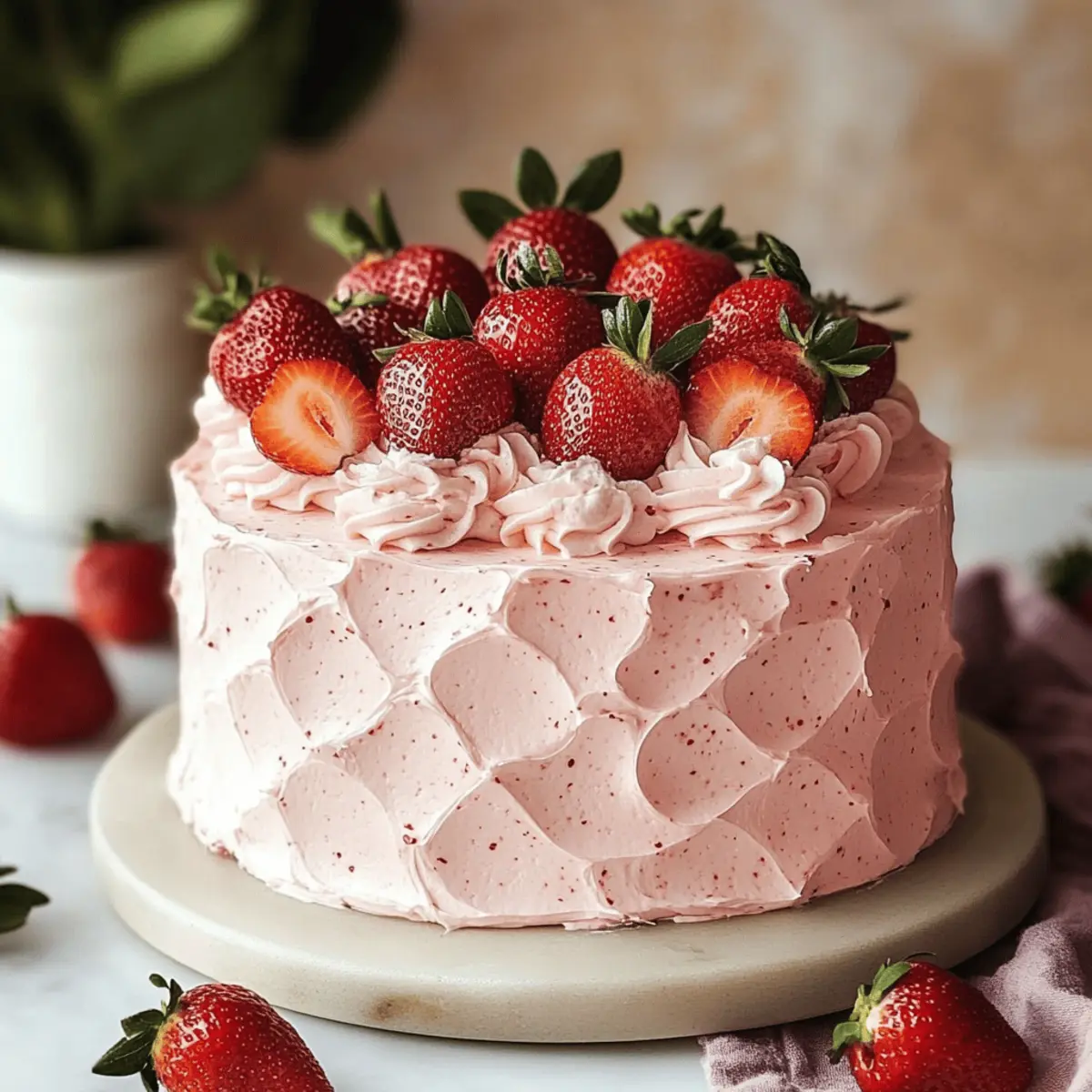 - Assemble Cake: Level cooled layers, slice each horizontally into two, spread jam and frosting between layers, stack, and decorate with remaining frosting and diced strawberries.