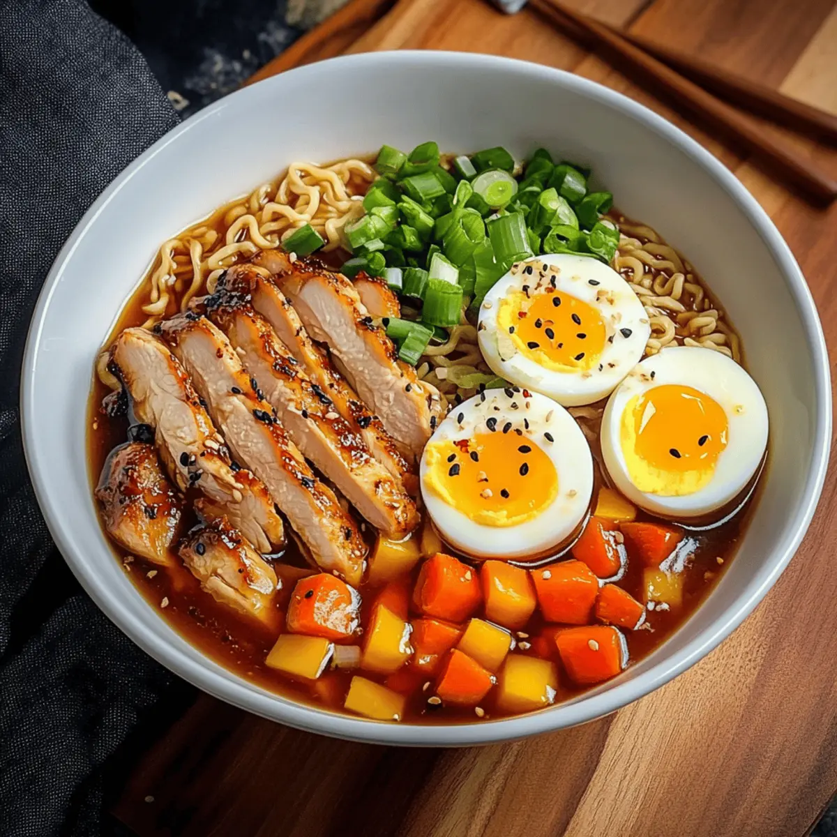 - Assemble the ramen bowl by layering noodles at the bottom, followed by the broth and vegetables. Top with sliced chicken, halved eggs, and garnish with green onions.